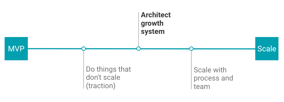 A Growth System Architect steps in after product/market fit, when the product clearly creates value but the path to breakout scale isn’t obvious. Generally the PMF validation and early traction will be established doing things that don’t scale, as recommended in Paul Graham’s famous article. The Growth System Architect is usually that of an individual contributor, but one who must collaborate closely across product, marketing, and engineering to stitch the system together.